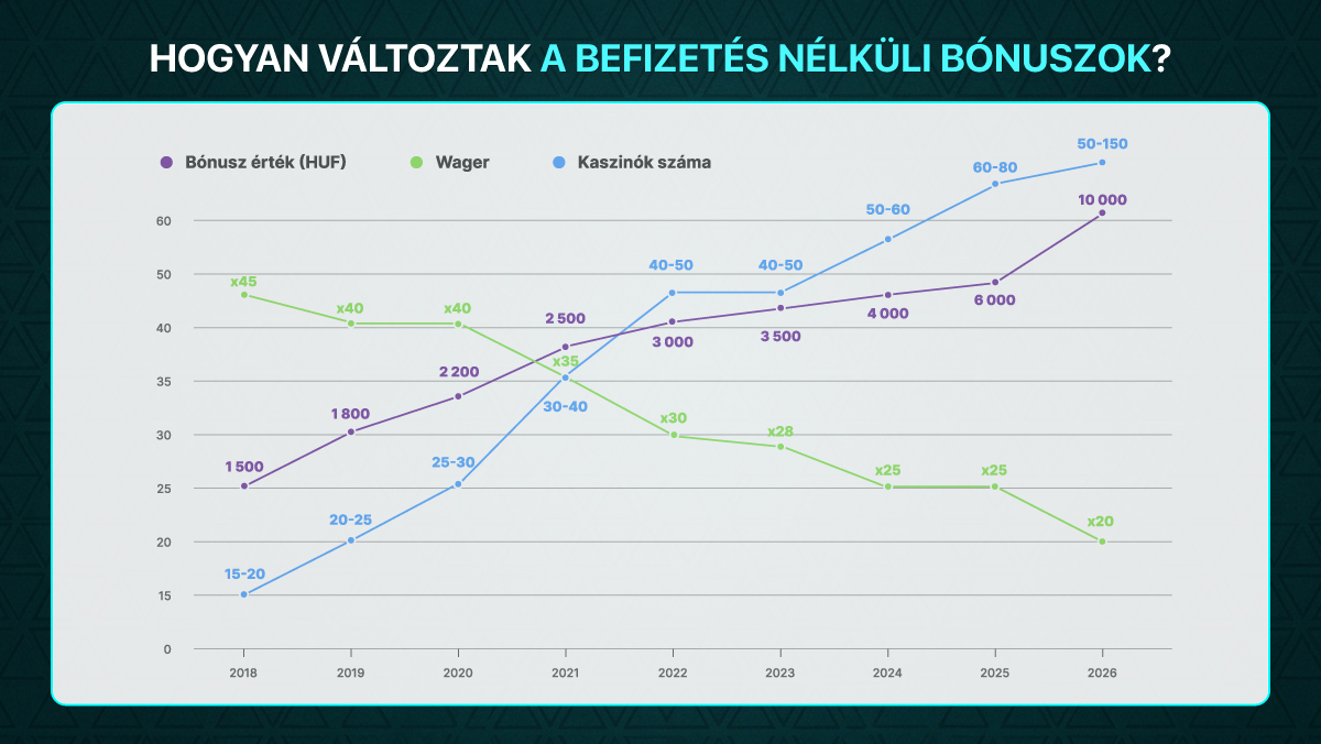 Az egyik leglátványosabb változás a casino bónuszok értékében történt. Az átlagos befizetés nélküli kaszinó bónusz 2018-ban még körülbelül 1500 Ft volt, 2026-ra viszont elérte a 10000 Ft-ot. Ez több mint hatszoros növekedés. A legnagyobb ugrás 2024 és 2026 között történt, ami azt mutatja, hogy a magyar online kaszinók közötti verseny az utóbbi időben tovább erősödött.