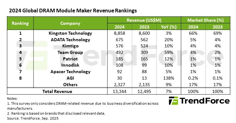 A jelentés kiemelte, hogy a világ öt első számú memóriamodul-gyártója tette ki a 2024-es összértékesítések 81%-át, az első nyolc pedig 83%-os piaci részesedést tudhatott magáénak. Az eredmények megerősítették, hogy a Kingston dominánsan vezeti a DRAM-modulok piacát, mivel a második helyen álló szállító a teljes piaci részesedésből mindössze 5 százalékot tudott megkaparintani. 2023 4. negyedévének végén a DRAM-beszállítók elkezdték előnyben részesíteni a nagy sávszélességű memóriákat és a szerverminőségű DDR5-termékeket. Ez a stratégiai váltás a többi DRAM-típus szűkebb elérhetőségéhez vezetett, ami megnövelte a keresletet, és összességében magasabb árakat eredményezett. Válaszul a modulgyártók növelték a beszerzést és feltöltötték készleteiket, ami 2024-ben összesen 13,3 milliárd dolláros piaci bevételt eredményezett. Az év második felében azonban a modulárak emelkedése elkezdte visszafogni a keresletet, ami végső soron korlátozta az értékesítés növekedését.